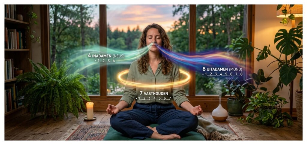 💡 Tip: Het gaat niet om de exacte tijdsduur, maar om de verhouding 4:7:8. Als 4 seconden te lang voelt, probeer dan 2-3,5-4 seconden. Het belangrijkste is dat je uitademing dubbel zo lang is als je inademing!