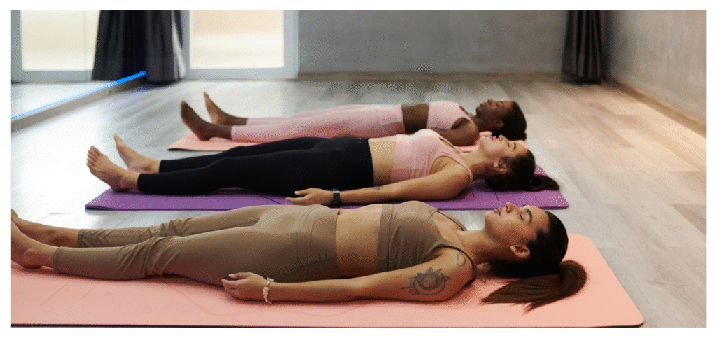 Door rustige houdingen en gecontroleerde ademhaling (pranayama) activeert yoga het parasympathische zenuwstelsel. Je hartslag daalt en je voelt meer rust van binnen.