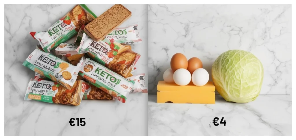 Laten we eens kijken naar de cijfers. Een ‘koolhydraatarm brood’ kost in de supermarkt vaak tussen de €4,00 en €5,50 voor een klein broodje. Een doosje met drie ‘Keto-repen’ kost je al snel €6,00. Terwijl de basisproducten (zoals eieren of groenten) per portie slechts een deel daarvan kosten.